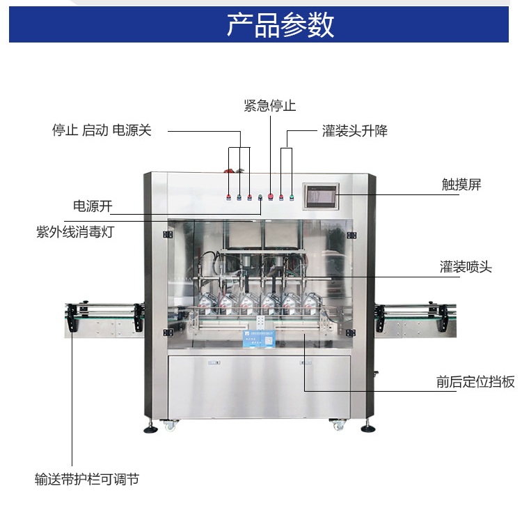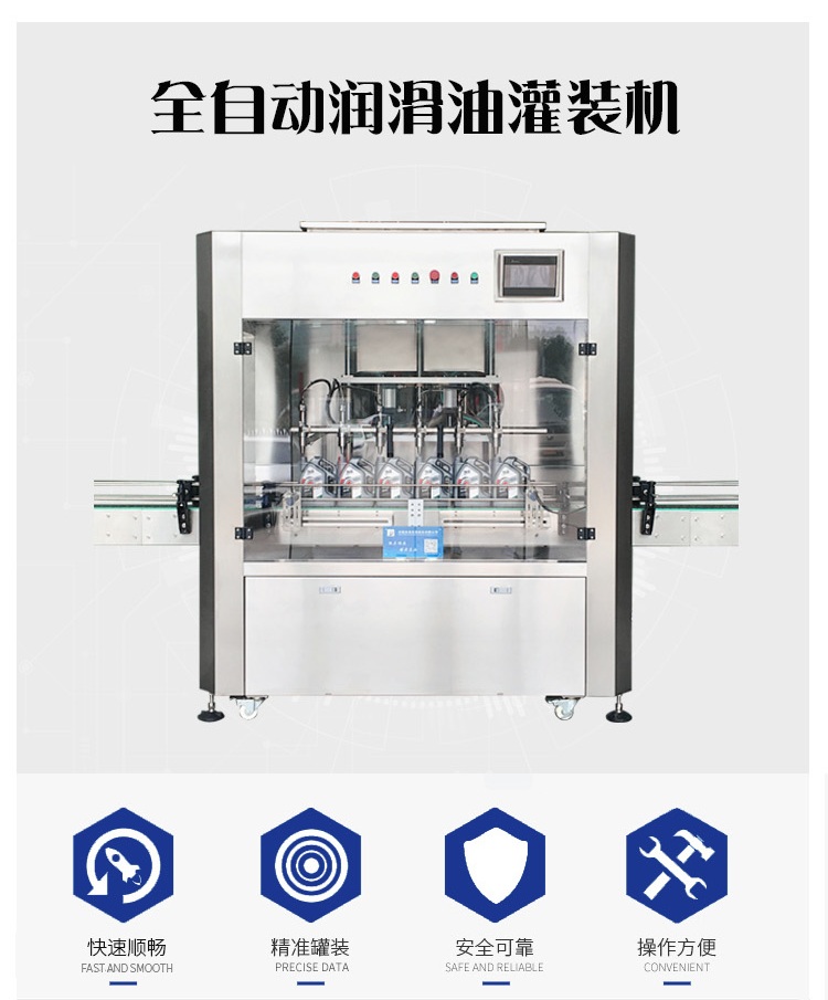 該六頭柱塞式全自動潤滑油灌裝機特的灌裝頭設計及真空回吸系統,確保灌裝過程無殘油滴漏,快慢雙速灌裝,灌裝速度可調,杜絕溢瓶現象。該機采用動力灌裝,無需配裝高位罐,簡化了安裝工序,提高了灌裝效率。履帶式壓蓋機,穩定無噪音,無空壓現象。觸摸屏界面友好,操作簡捷,SIEMENS PLC控制系統,運算速度快,性能穩定,品質卓越。電、氣件均采用精品元件,確保整機運作穩定。