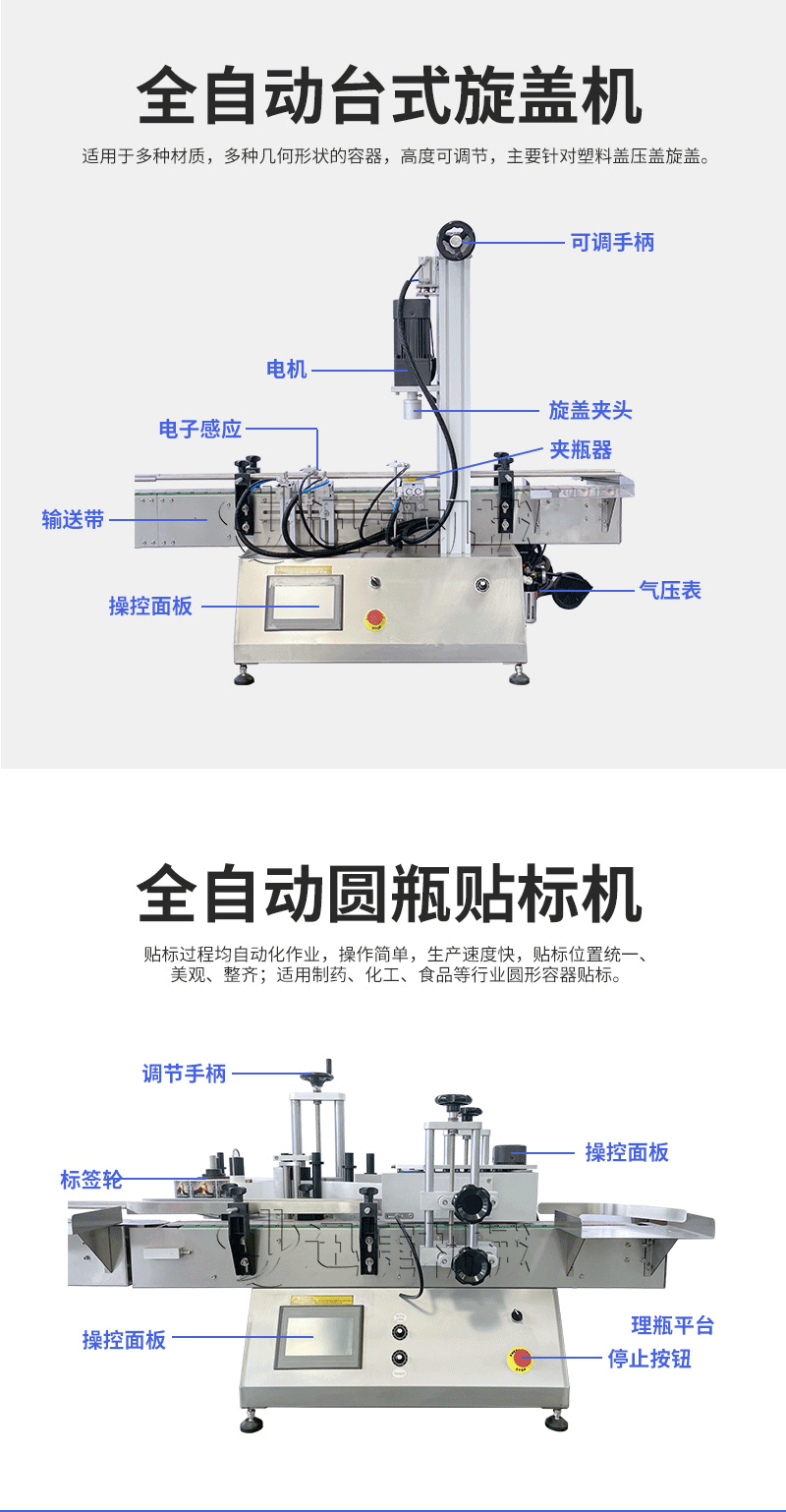 產(chǎn)品說明:桌面型膏液灌裝生產(chǎn)線根據(jù)灌裝范圍選擇型號(hào),灌裝部分為雙頭下潛式灌裝機(jī),適用于不同物料不同瓶子的灌裝,配備自動(dòng)壓蓋機(jī)和圓瓶貼標(biāo)機(jī),可實(shí)現(xiàn)不同蓋子的旋蓋貼標(biāo)工作。