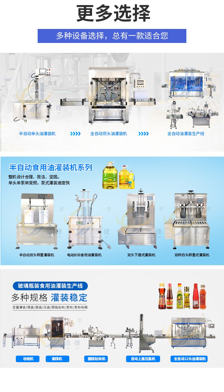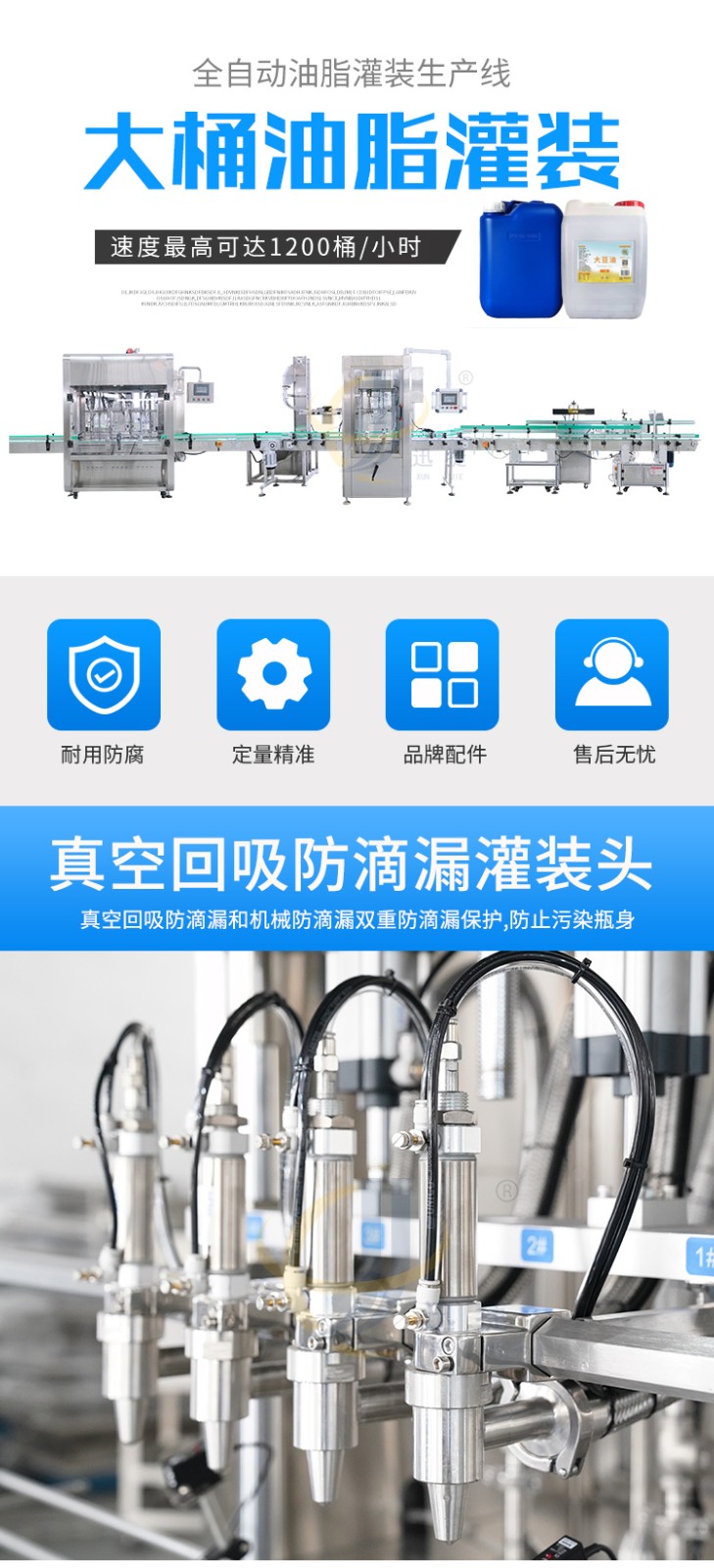 全自動(dòng)油脂灌裝生產(chǎn)線適用于灌裝各種油類及粘稠液體,如花生油、調(diào)和油、菜籽油等食用油的灌裝。可根據(jù)灌裝需求定制機(jī)型。