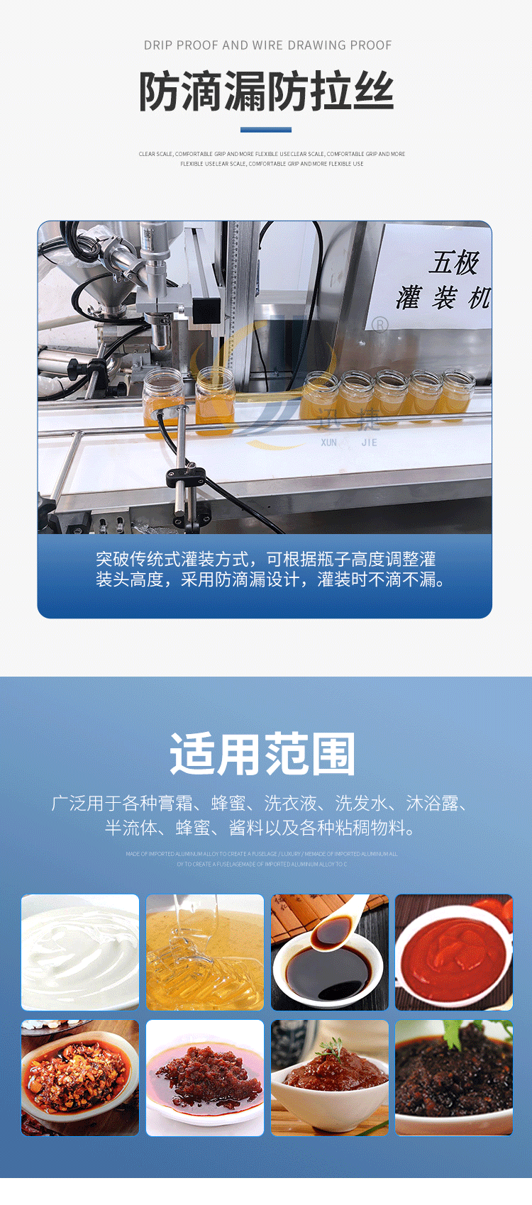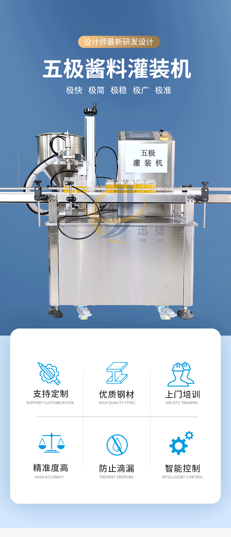五極灌裝機(jī):極快-單頭2200瓶/時(shí) 極簡-操作簡單 極廣-啥啥都能灌 極穩(wěn)-24小時(shí)不停機(jī) 極準(zhǔn)-200g誤差小于1g。它可以和真空旋蓋機(jī)搭配使用。