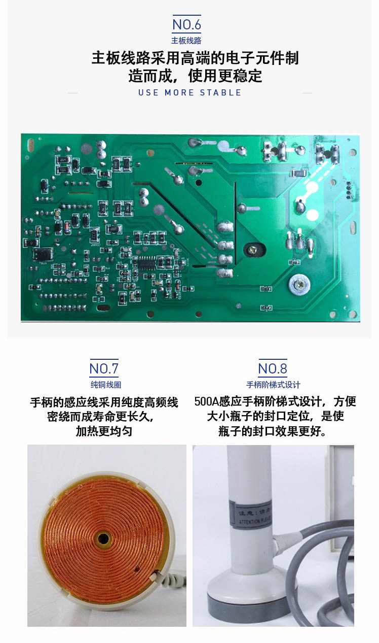 本機采用國外先進線路,選用日本新模塊化功率器件,較于一般電子感應加熱器更省電,熱效率達到90%以上,瞬時加熱速度為后者的20-30倍,因此不僅 適用于熱封性能較好的聚乙烯、聚丙烯材質的瓶體,而且對熱封性能較差的聚酯瓶、玻璃瓶也有極好的封口效果。